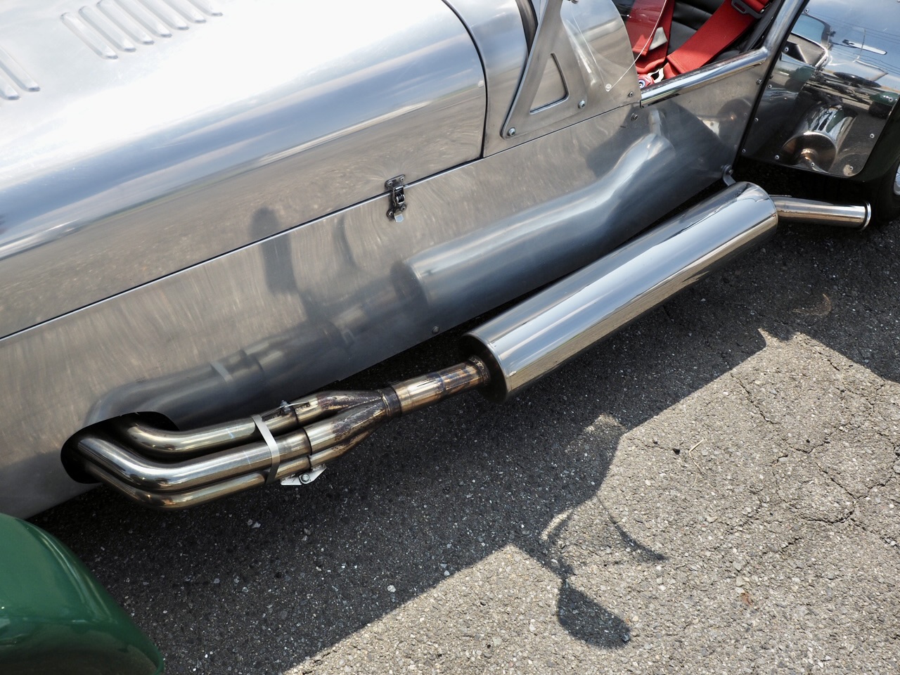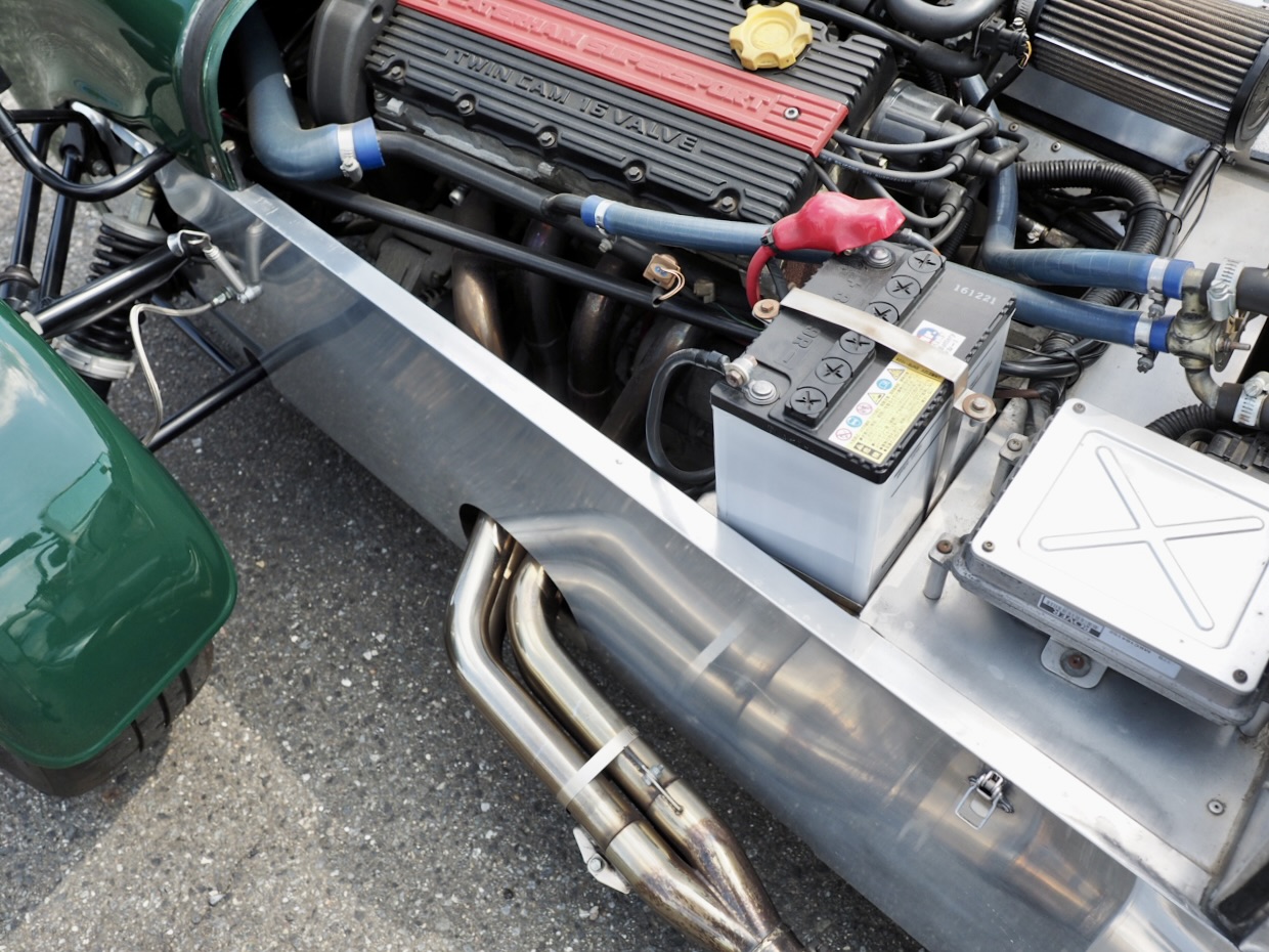 有機物のような美しいエキゾーストマニホールドの造形を経て、クラシカルに左サイドから吐き出されるのは圧倒的な音圧・・・!そしてアルミカバーを外すと剥き出しになるローバー製1.8L Kシリーズユニット・・・。