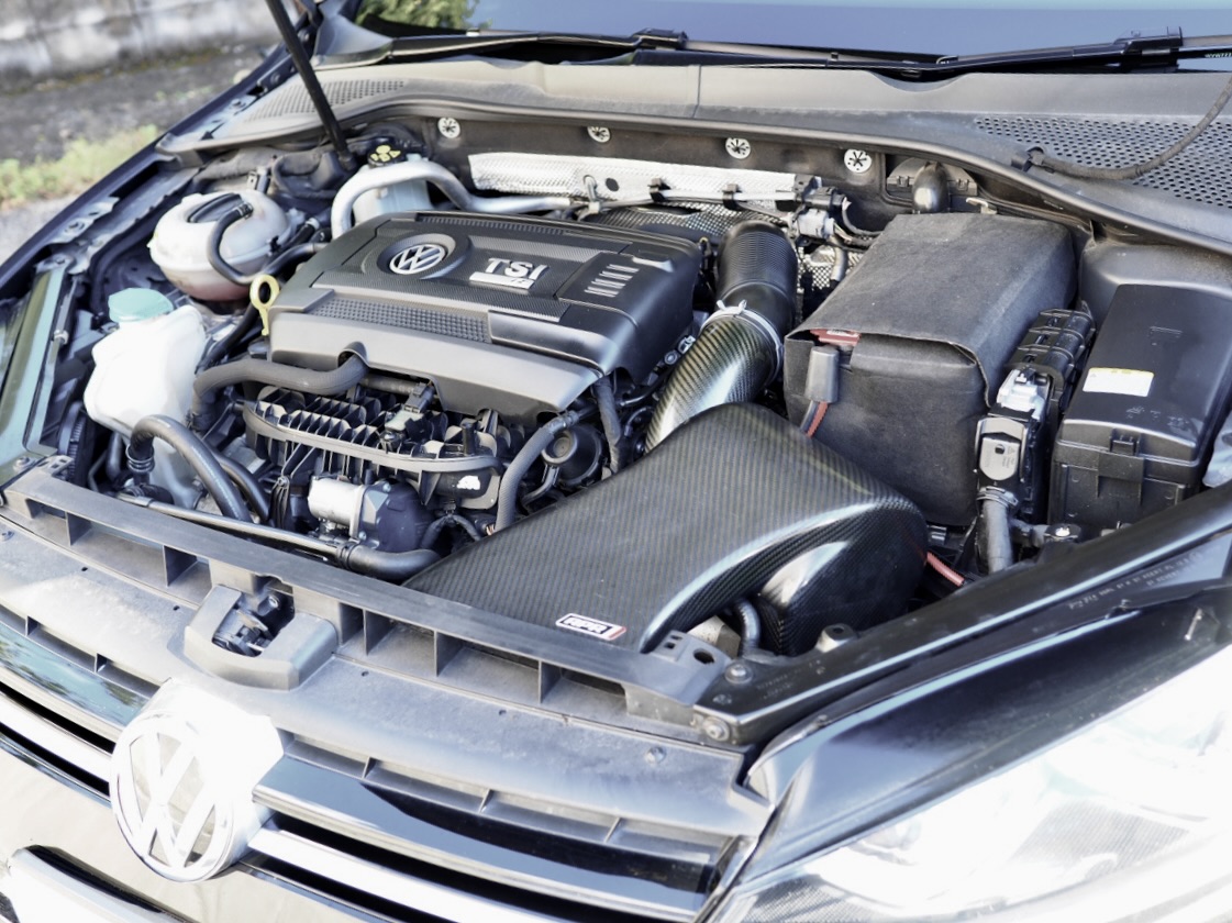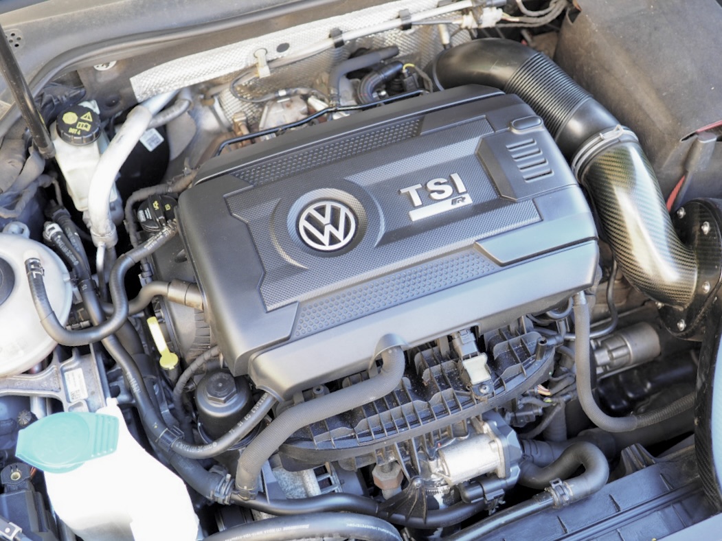 吸気系にはアメリカのフォルクスワーゲン専門チューナーAPRが、ターボエンジンの吸気効率とレスポンスを最優先に設計したAPR製スポーツ・エアクリーナーを装着・・・。