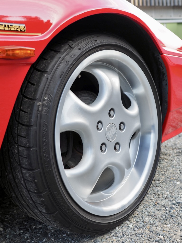 Next, while the original wheels have been carefully stored in the garage, the car has been fitted with German-made RH Alurad wheels—17 inches at the front (215/40R17) and 18 inches at the rear (245/40R18). These are paired with modern Dunlop low-profile tires (DIREZZA D101). To match the visual balance of the lower-profile stance, adjustable coilover dampers were installed. Ground clearance is still properly maintained, yet the Esprit has been beautifully transformed into a wider, lower, more assertive presence.