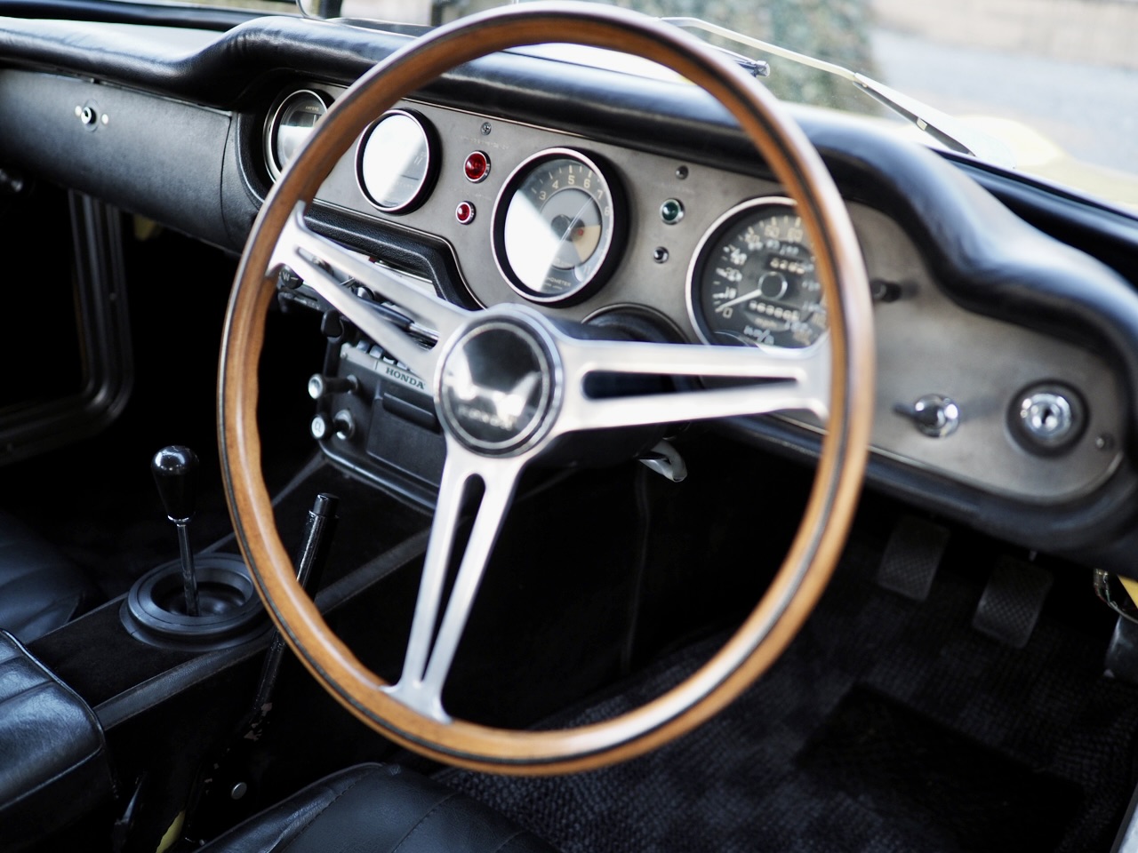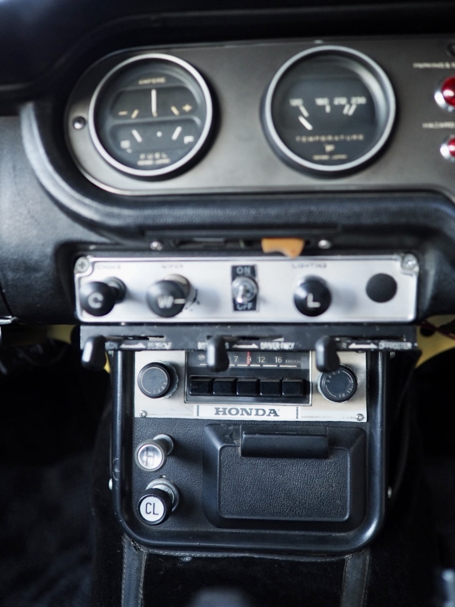 Cradling the slender original steering wheel, legs stretched forward from the low hip point of the seat, operating the ABC pedals naturally—this layout is pure 1960s European sports car philosophy. The immaculate, crack-free crash pad, the woodgrain-style meter panel Honda once used to evoke luxury, and the minimal array of original switches all aligned in period-correct fashion—each detail sends a shiver through the soul every time it’s touched.
