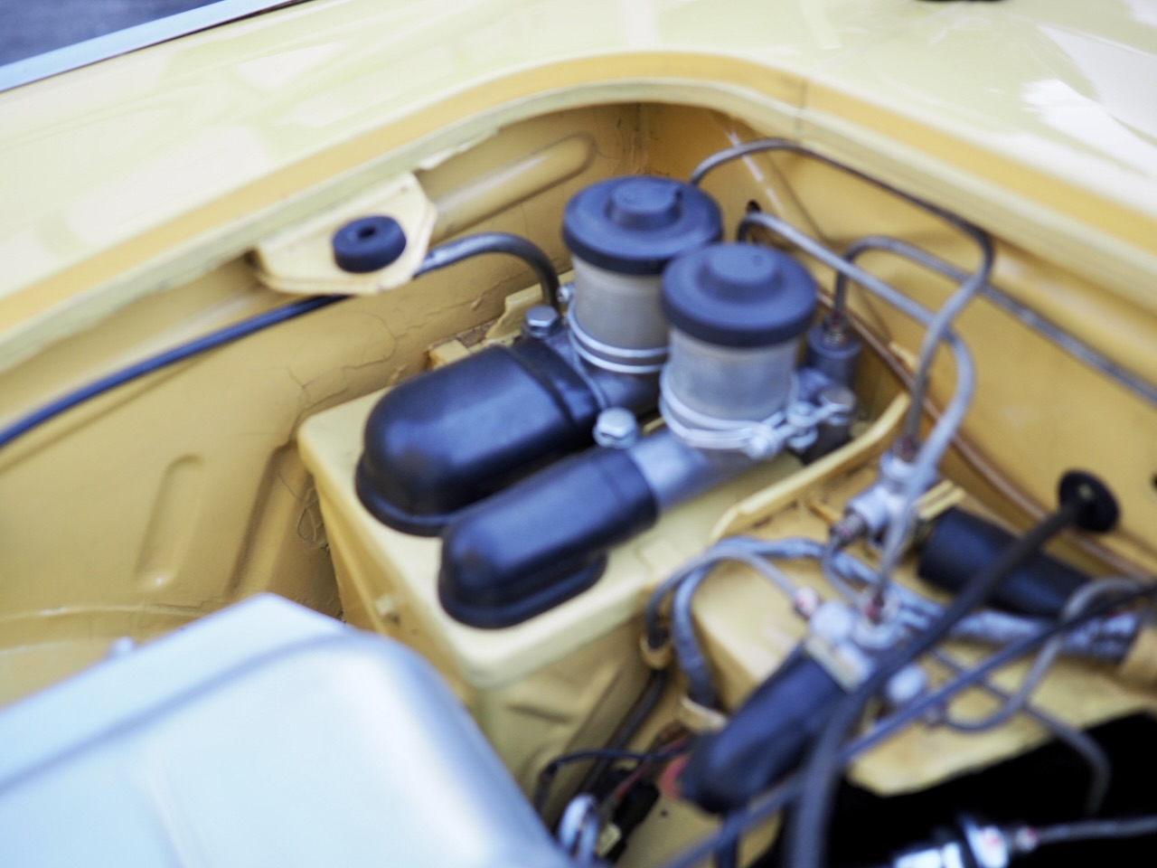 Although this is a right-hand-drive car, the speedometer is calibrated in miles, and details such as the shape of the side markers, the dual-circuit brake master cylinder, and the marking inside the engine bay reading “BS AU48·1965” (British Standard Automotive Use 48) quietly indicate that this car was built with British regulatory standards in mind. Combined with the fact that the first domestic registration on record is Heisei 11 (1999), it becomes clear that this is a car that was re-imported into Japan in 1999…
