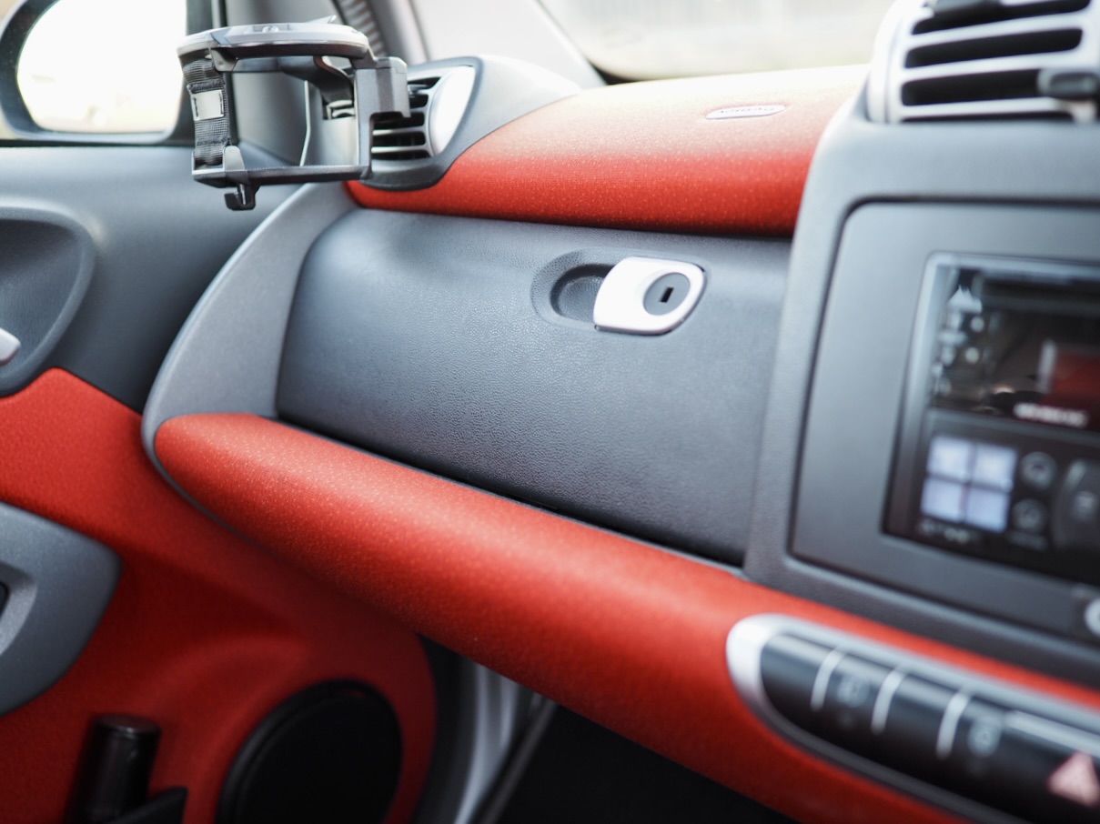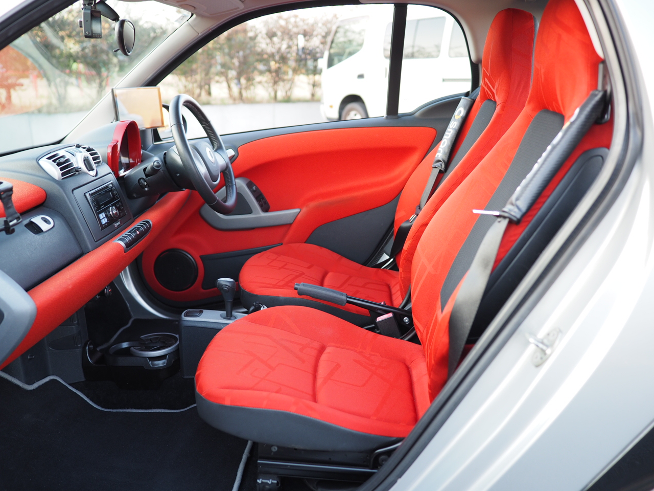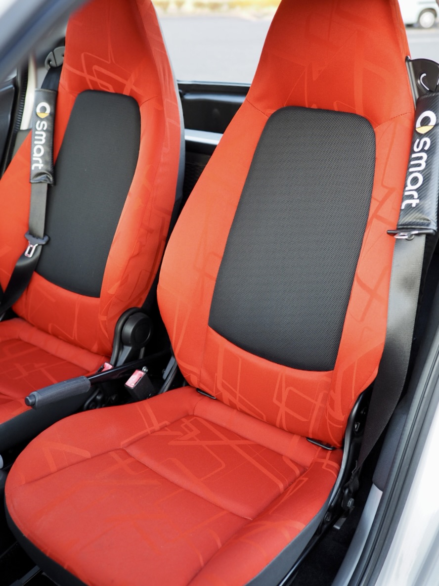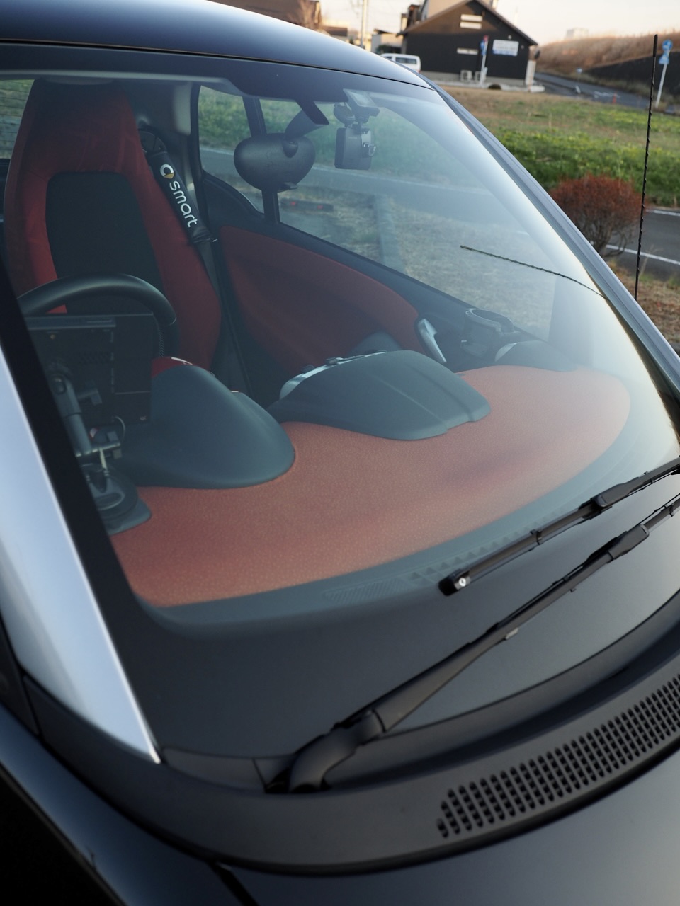 大きなフロント・ウインドウシールドとサイドシールドから覗く、内装色デザインレッドが、ブラックという強いボディカラーに重たさを与えず、実にモダンでポップな印象さえ与えているのはまさにスマート・マジック・・・!