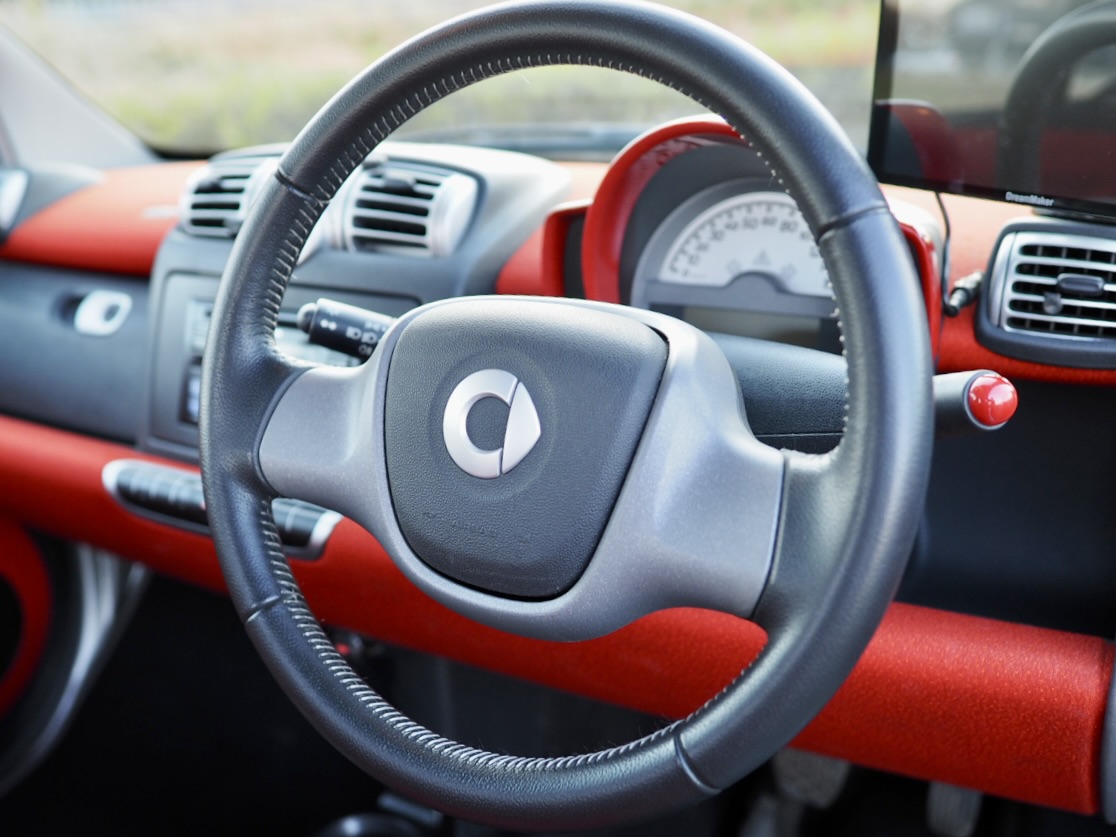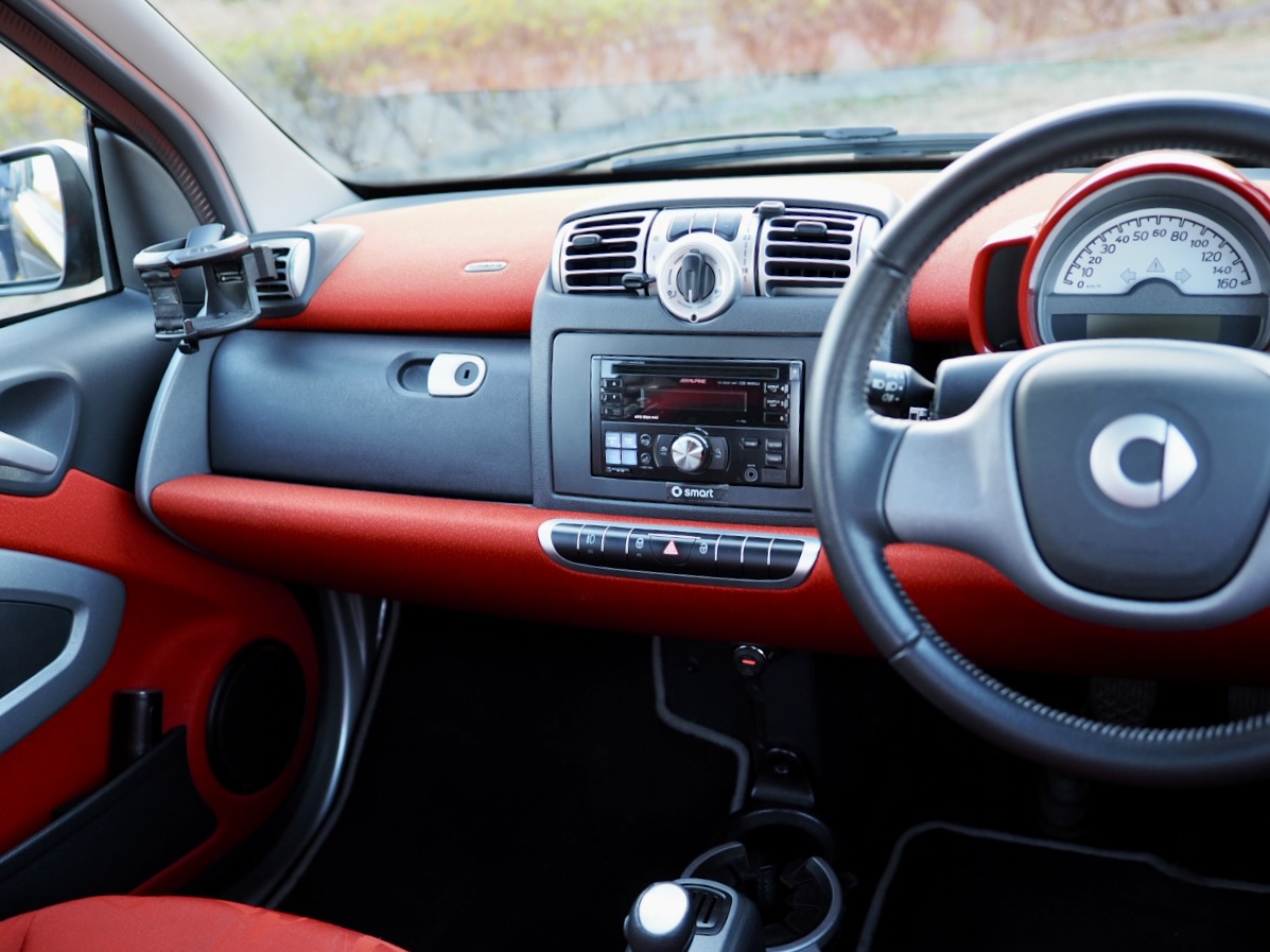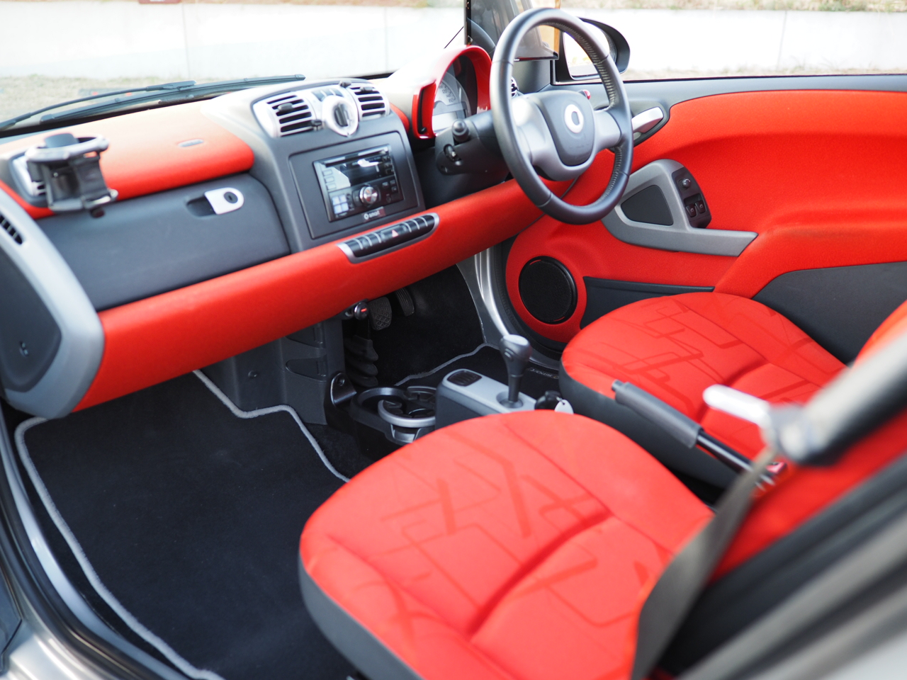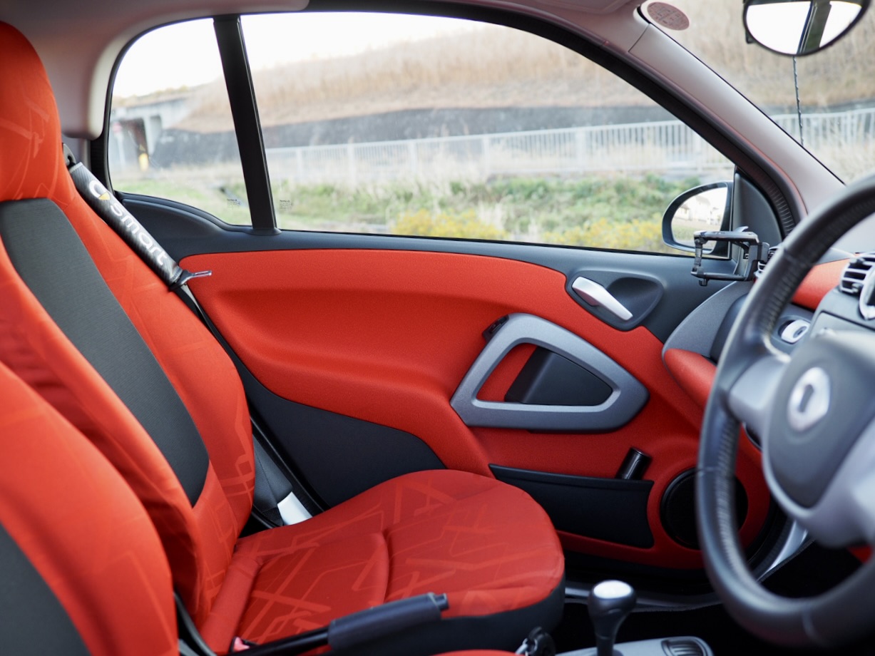 Seen through the large front windshield and side glass, the Design Red interior prevents the strong black body color from feeling heavy, instead giving the car a modern—even playful—impression. This is pure Smart magic…