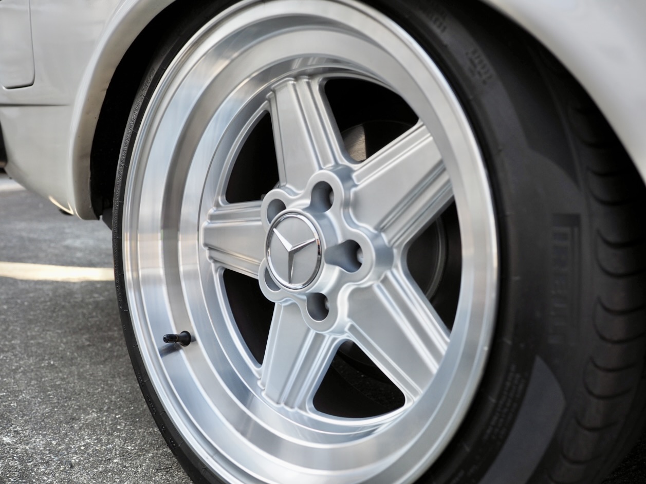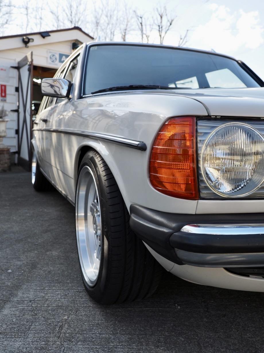 “This was something I absolutely wanted to achieve with the lowering (laughs),” says the owner. Completing the look are custom-made AMG Pentas in an otherwise nonexistent 17-inch size, commissioned from a European specialist. The deep rims are outrageously good-looking. Combined with fresh Pirelli tires, they strike straight at the enthusiast’s heart. With front 8J and rear 9.5J widths, the rear view in particular is commanding, perfectly complementing the car’s long proportions and making it clear this is no ordinary W123 wagon. The original Mercedes “Sazae” wheels have been refinished and are included as well.