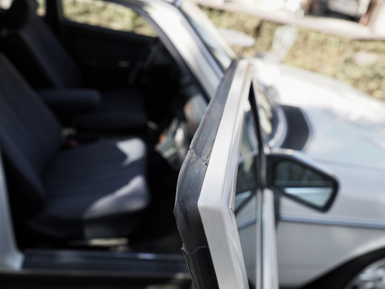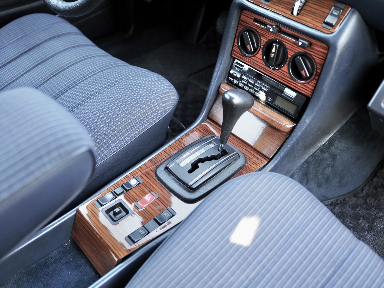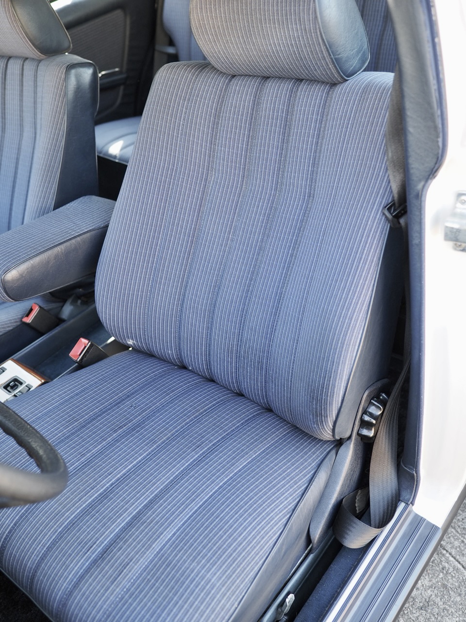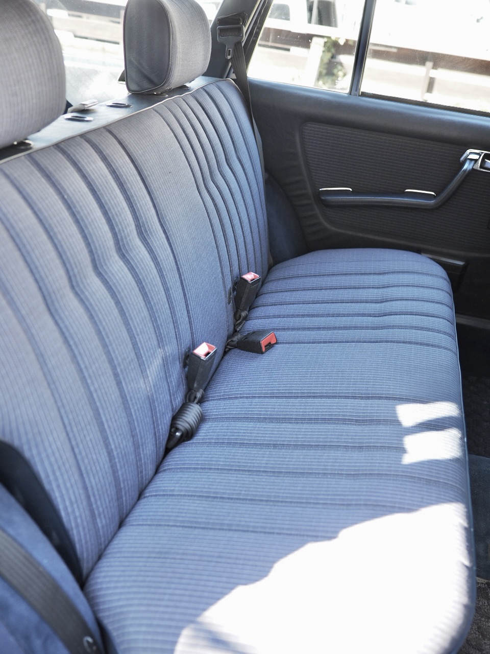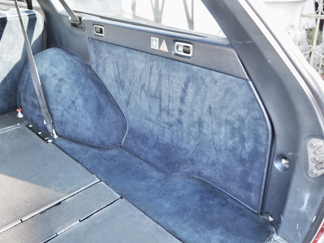 The front seats, originally showing age in their striped cloth, were replaced with high-quality used seats in the same blue striped fabric imported from overseas. Even the headrests were sourced individually—one from France, one from Germany. The rear seat remains original due to its excellent condition, resulting in an interior that feels remarkably fresh. All door and rear hatch weatherstrips were also replaced, eliminating rattles during startup vibrations and restoring the signature soft, satisfying W123 door-close sound.