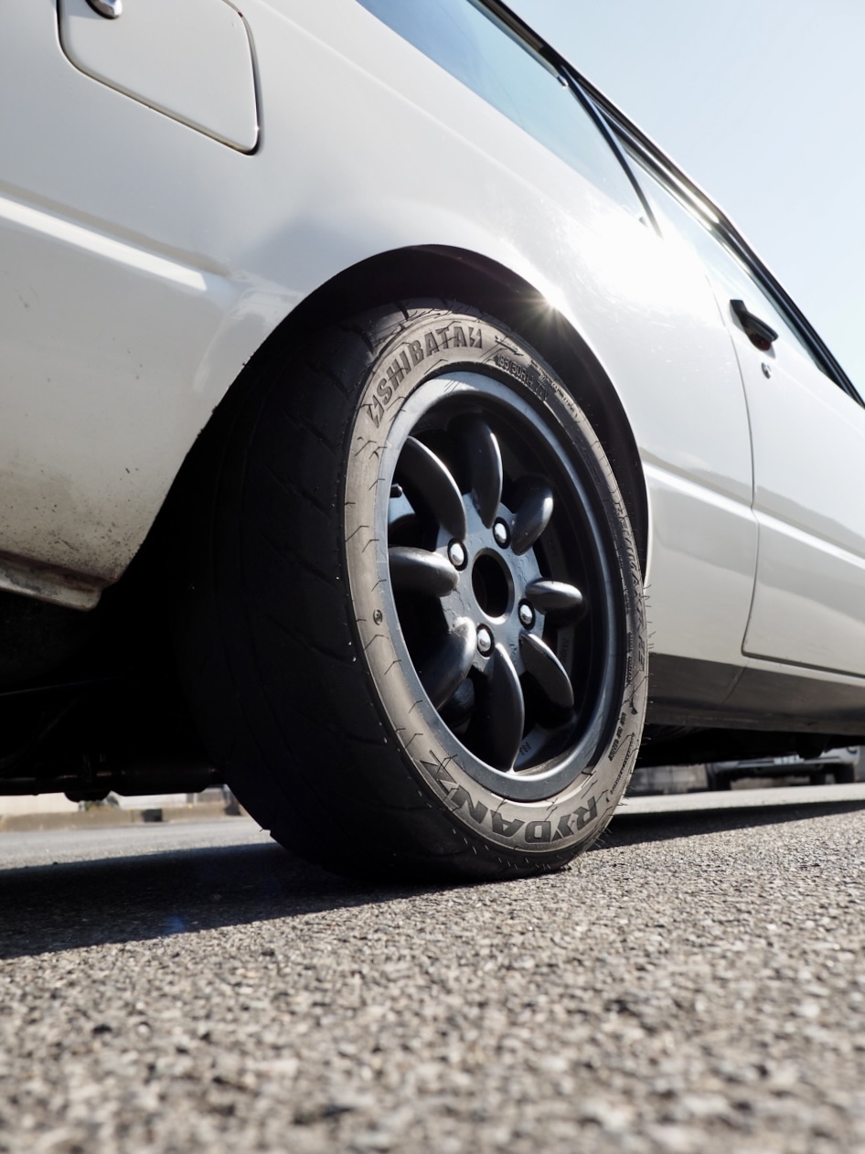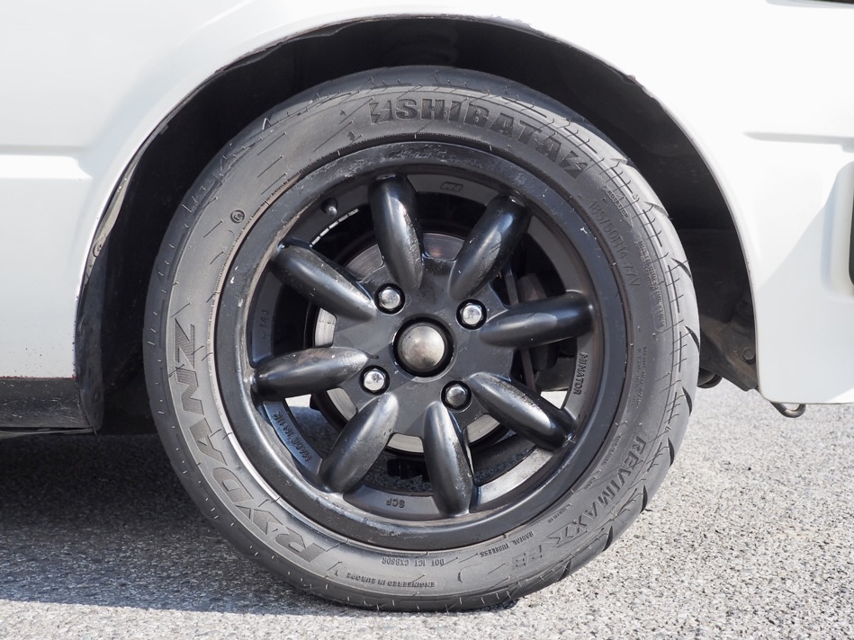14インチの英国製ミニライト・アルミホイールにシバタイヤ製185/50R14ラジアルタイヤを収める姿・・・、その佇まいは、明らかに走るための姿勢と思えるのが素晴らしいところです・・・!