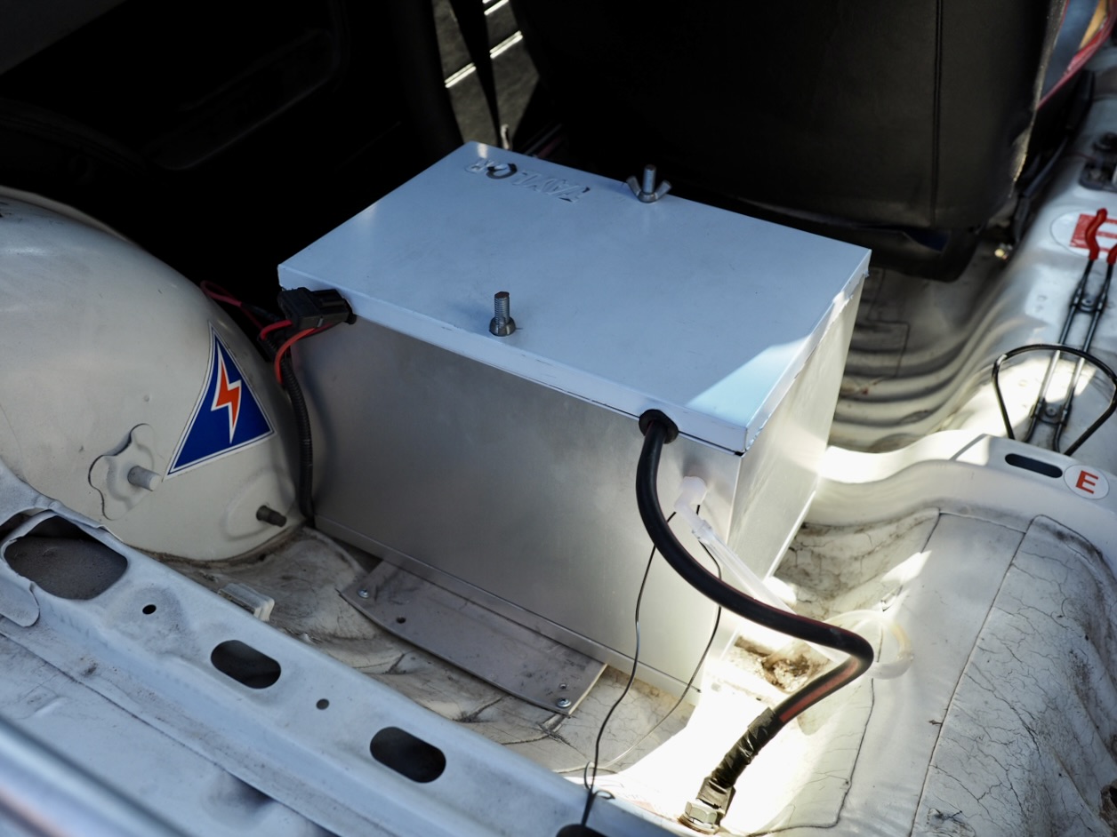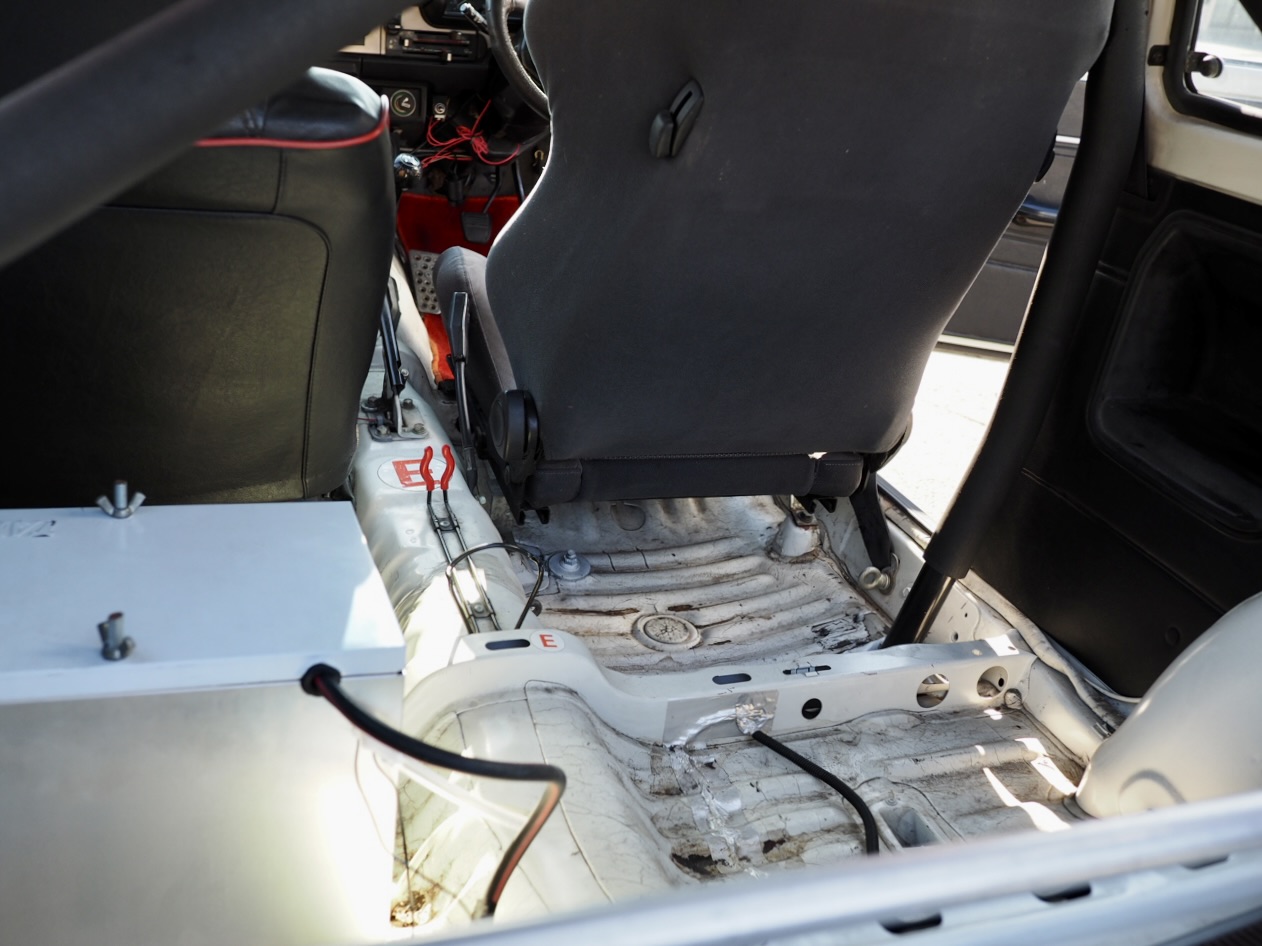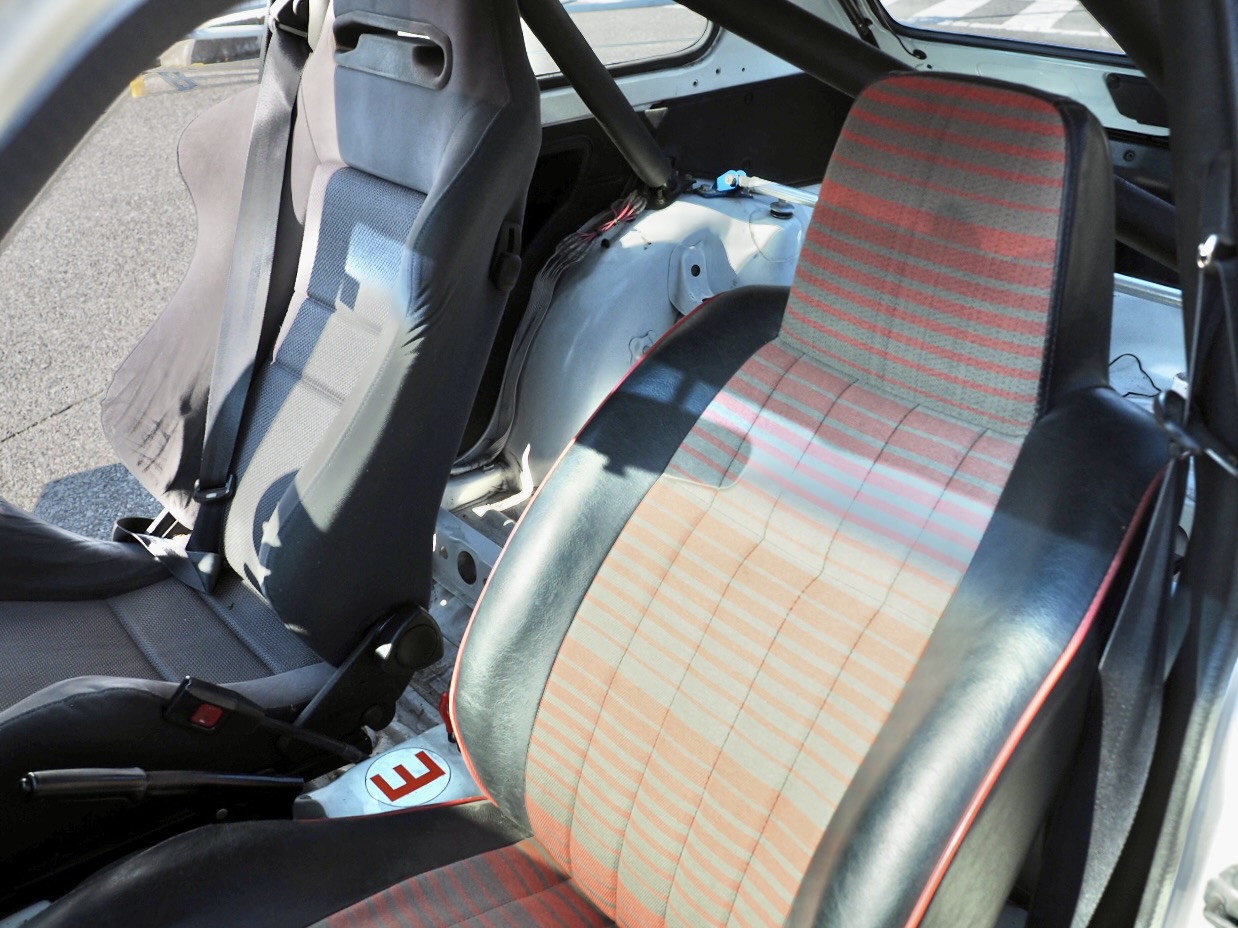 ドライバーの背後には5点式ロールバーが安心感と剛性を高め、アルミバッテリーボックスと車内燃料ポンプが本気度を物語る・・・。