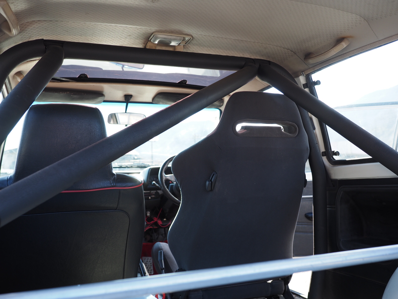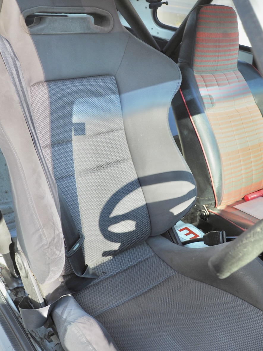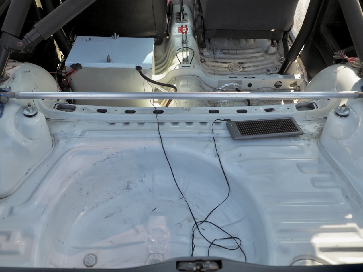 ドライバーの背後には5点式ロールバーが安心感と剛性を高め、アルミバッテリーボックスと車内燃料ポンプが本気度を物語る・・・。