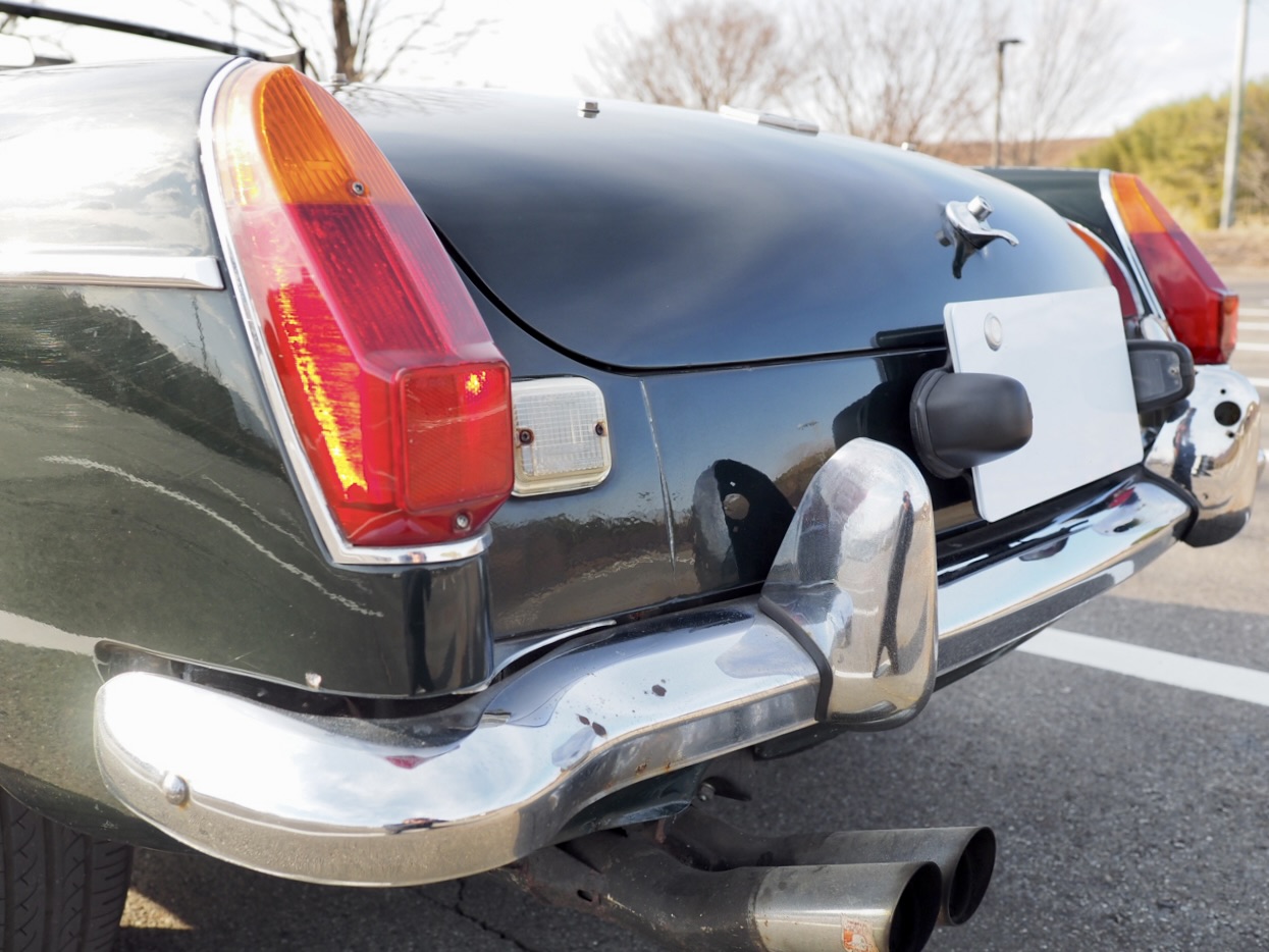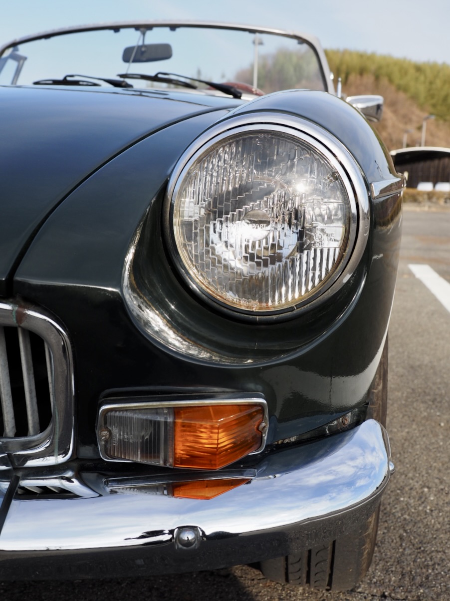 冬特有の斜めからのオレンジ色の太陽光線の元、数年前にこのメッキコンバージョン〜全塗装が実施され、真新しい雰囲気が経年と共に浄化され色合いも雰囲気良く馴染み、外観上はMk-IIそのものと見受けられる最終80年式のMGBは、実にしっとりと筆者も目前に佇みます・・・。