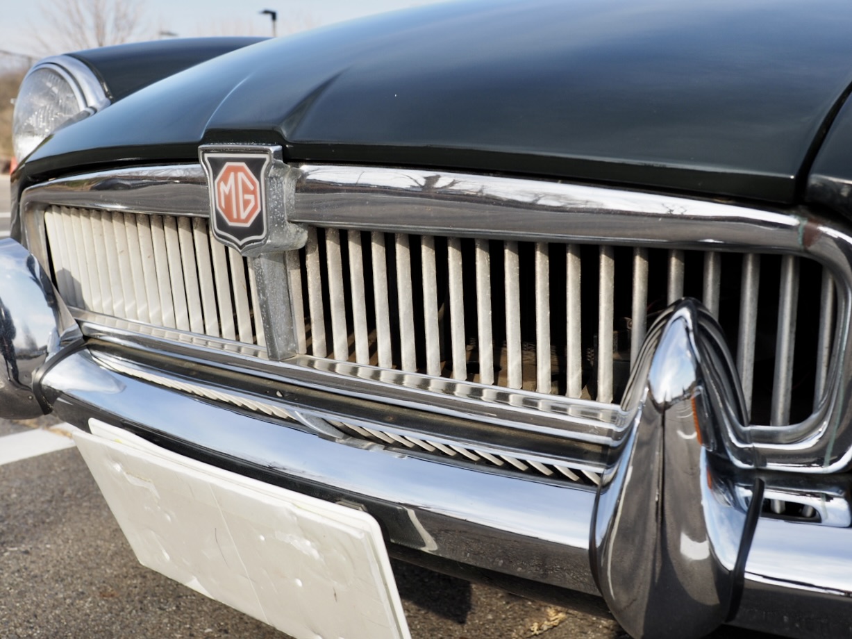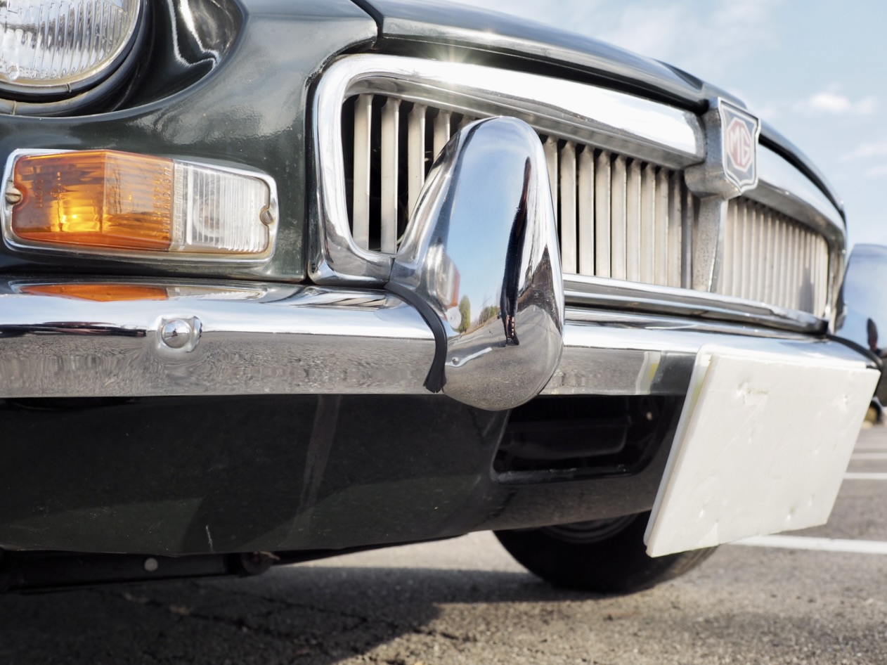 重量のある前後ウレタンバンパーが外され、前後ともプロフェッショナルの手で、顎下が丁寧に整形され、60年代後半のMG Mk-IIの面影をオマージュし、特徴的なグリルと流麗な形状を持ったメッキバンパーを再度装着・・・。その際に顎下整形が必要なため、当時を彷彿とさせるブルックランズ・グリーンで丁寧に全塗装して仕上げる・・・。