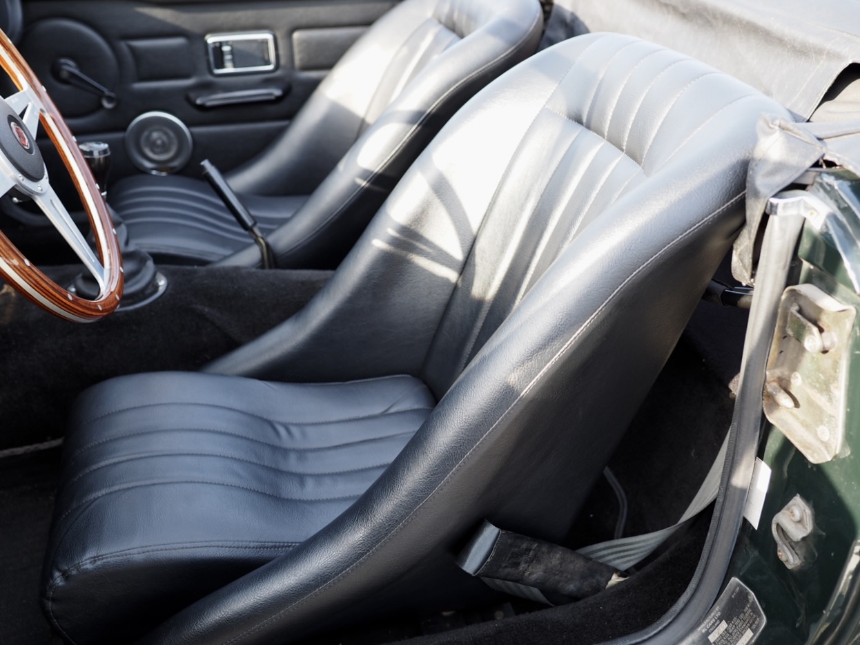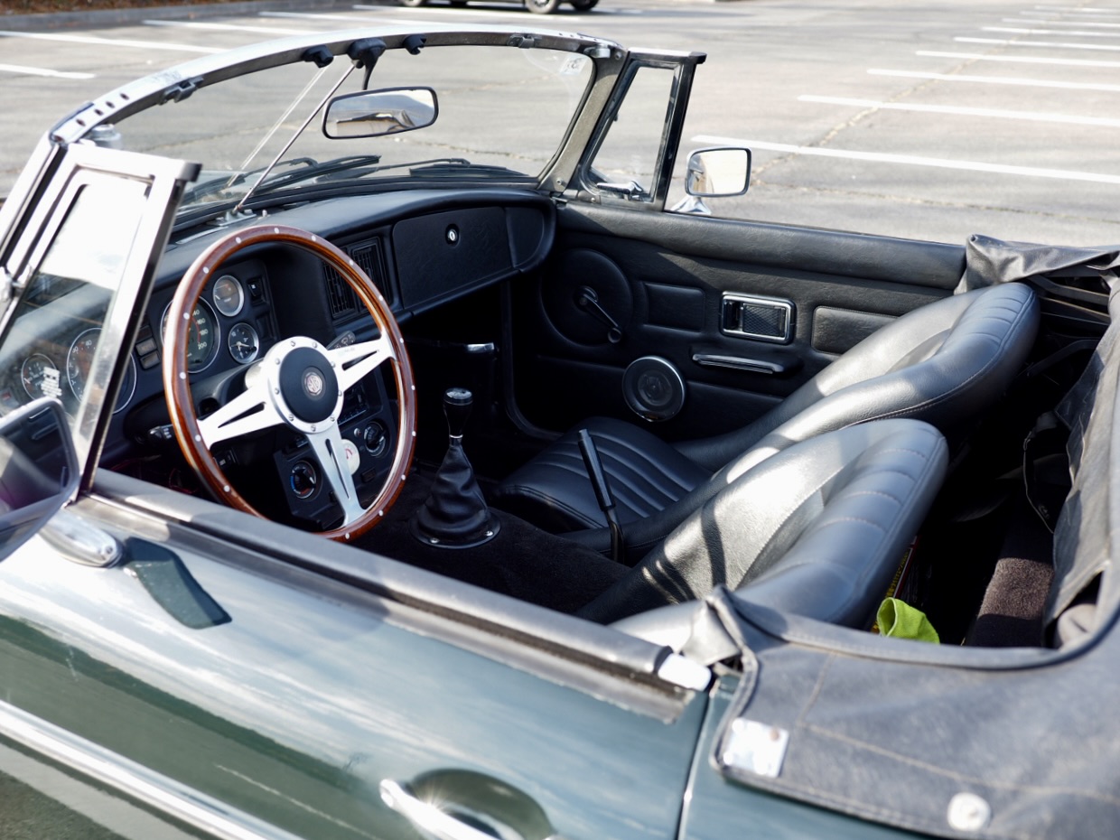 光の当たり方によって深い緑から黒にも見えるこの色合いは、まさに英国の名門サーキット“ブルックランズ”の名を冠したクラシックカラーで、MGBというクルマの持つ英国的気品と軽快なスポーツ性を見事に引き立てています・・・。