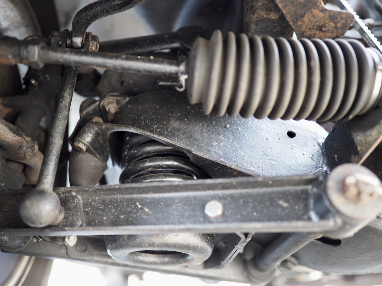 Simply removing the heavy polyurethane bumpers causes the ride height to rise significantly, and in that state it would be impossible to achieve the flowing stance and atmosphere characteristic of the MGB. During the chrome conversion, the front coil springs housed within the lever-arm dampers were replaced with properly sized units, while at the rear—featuring a rigid axle with leaf springs—custom spacers were specially fabricated to achieve the correct balance.